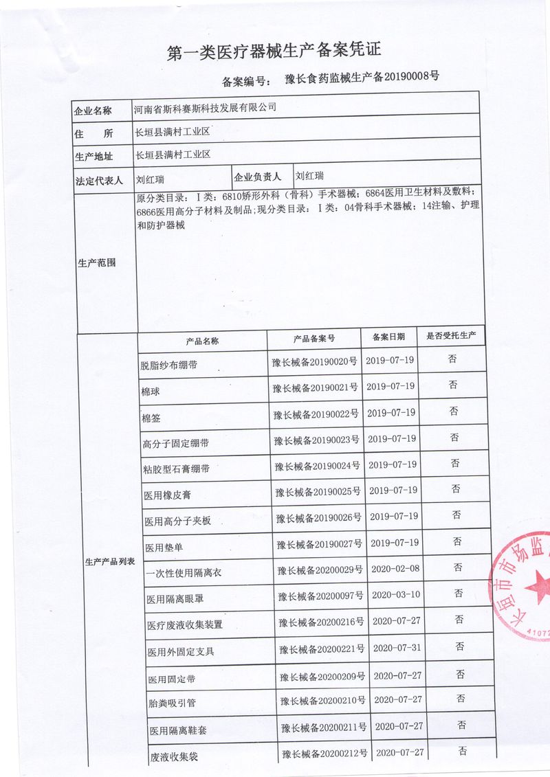 河南省斯科賽斯科技發(fā)展有限公司創(chuàng)建于 2011 年,位于“中國醫(yī)療耗材之都”- 河南省長垣縣,西臨 308 省道,南靠新菏鐵路,北依長濟(jì)高速,交通便捷,經(jīng)濟(jì)發(fā)達(dá),環(huán)境優(yōu)美。斯科賽斯積極進(jìn)入醫(yī)療健康和服務(wù)領(lǐng)域,秉承為用戶創(chuàng)造價值的理念,專注于醫(yī)用耗材解決方案的研發(fā)和運(yùn)營,并為用戶提供完善的產(chǎn)品解決方案;  斯科賽斯主要生產(chǎn)醫(yī)用麻醉系列、醫(yī)用高分子系列、醫(yī)用敷料包系列、醫(yī)用無紡布系列、醫(yī)用防護(hù)系列、醫(yī)用脫脂棉系列、生物材料制品類等七大類、100 多個品種、400 多個規(guī)格的產(chǎn)品。公司占地面積約 30000 平方米,建筑面積20000 平方米,擁有 10 萬級的凈化車間總面積 10000 平方米。擁有國際先進(jìn)水平的生產(chǎn)設(shè)備和檢測儀器,技術(shù)裝備精良,檢測手段完善,為醫(yī)療行業(yè)的不斷發(fā)展進(jìn)步提供保障。公司順利通過 ISO9001、ISO13485 質(zhì)量管理體系認(rèn)證。  斯科賽斯堅持研發(fā)高科技新產(chǎn)品,力爭在醫(yī)療器械關(guān)鍵領(lǐng)域取得技術(shù)和研發(fā)的重大突破;立足國內(nèi)和國際兩個市場,逐步實現(xiàn)管理理念、經(jīng)營機(jī)制、人力資源、技術(shù)、產(chǎn)品、市場等全方位對接,提高企業(yè)的核心競爭力;過去的歲月里,斯科賽斯砥礪前行,誠信務(wù)實,銳意進(jìn)取,不斷創(chuàng)新,用自己的睿智和辛勞,以富有責(zé)任感的使命,在探索中追求,在追求中超越,致力于成為值得信賴的醫(yī)療用品生產(chǎn)企業(yè)!在未來的日子里,斯科賽斯將一如既往豪情滿懷,信心百倍,攜手并肩,執(zhí)著追求,向更高的的目標(biāo)前進(jìn),鑄造新的輝煌!